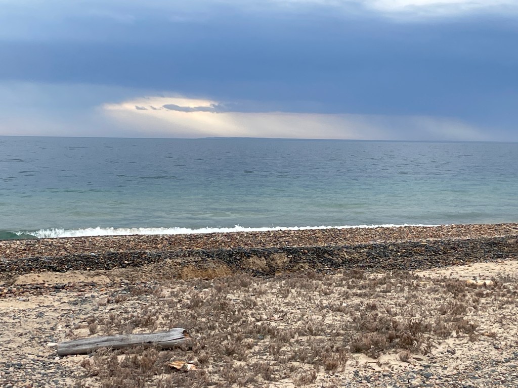 The view of Sault Ste. Marie from Whitefish Point. There are rain storms and the wind is bringing it towards us.