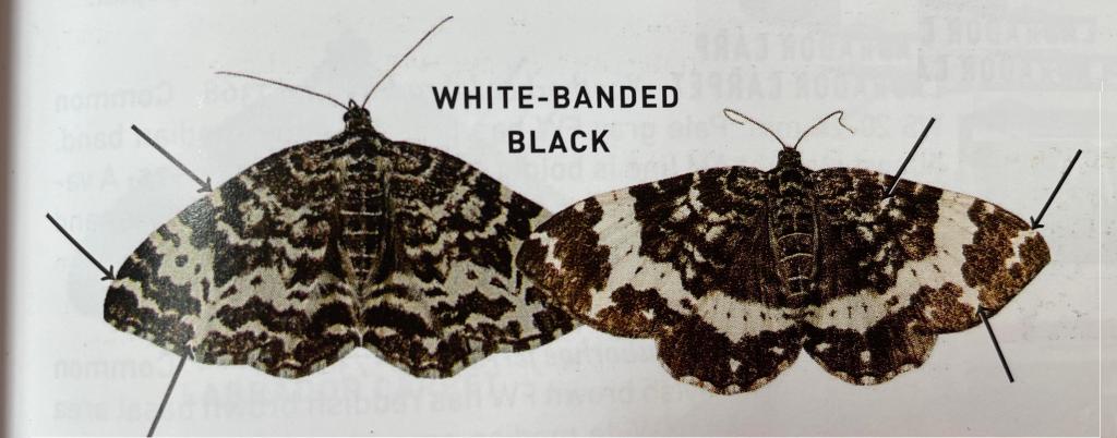 Here’s the figure from the Peterson guide to eastern North American moths for the white-banded black moth. The arrows are pointing to the critical wing characteristics.