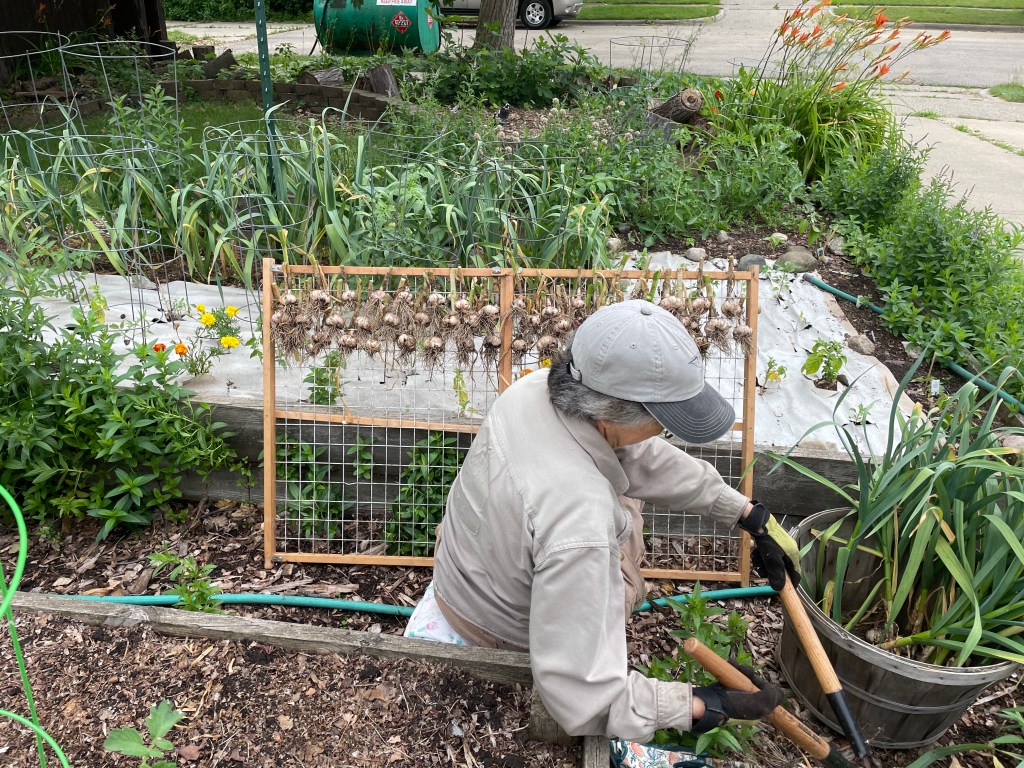 Then the garlic is trimmed and put into an old baby gate for drying which will take a couple of weeks.