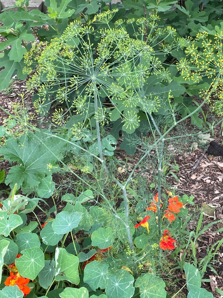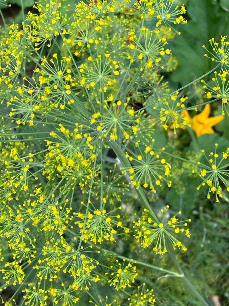 Dill flowers on thr left, mint flowers on the right. It’s nice having fresh mint for drinks and sauces. With the dill, I’ll probably start collecting leaves for drying and let the slower heads go to seed.