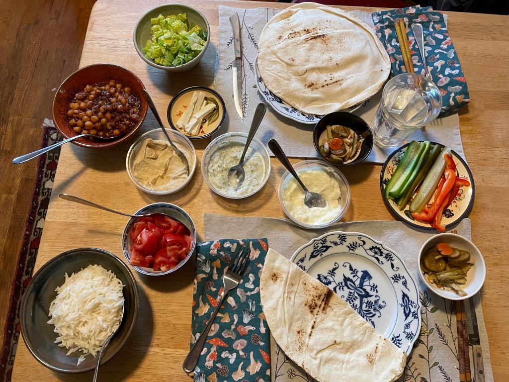 We had a spectacular dinner. Susan made falafel and we got tuum, humus, pita at El Harissa. I made mango-curried chickpeas and rice and this is what dinner looked like. Had to eat well since we were going to be up late with moths.