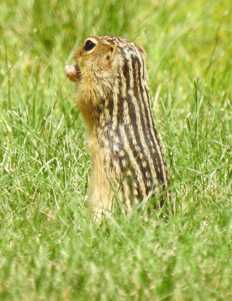 This afternoon we stopped at a rest area on I-75 just south of Grayling, Michigan. It has nice shady picnic tables that offer the chance of seeing and possibly photographing thirteen-lined ground squirrels. Today was just that day. These beauties are approximately the size of a small red squirrel.