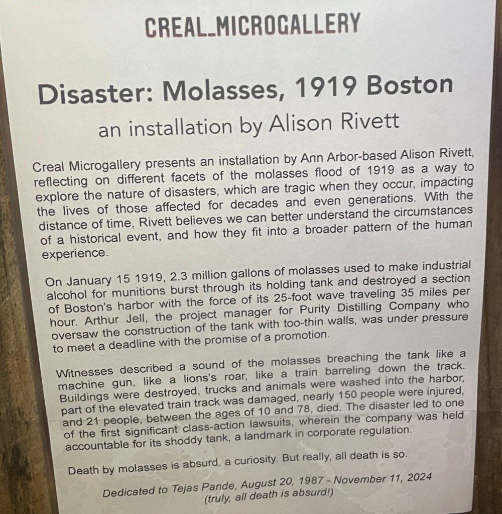 The artist’s insight into this awful event is quite interesting. But I’ll admit it’s difficult to envision over two million gallons of molasses forming a tidal wave.