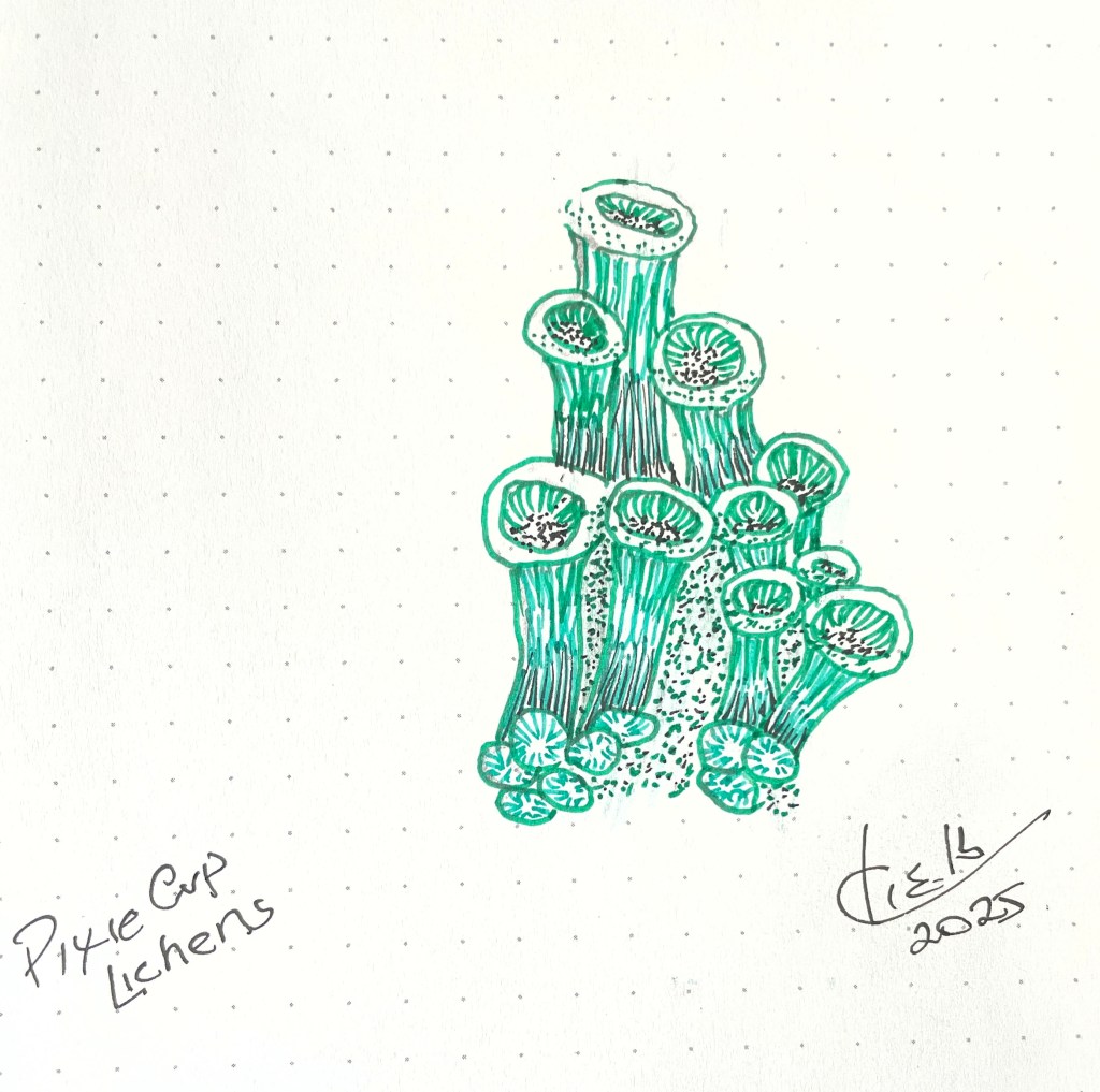 Over the years I’ve spent a lot of time looking at lichens. Pixie cups are members of the genus Caledonia a delightful group of small lichens that max out at about 25-30 mm tall.