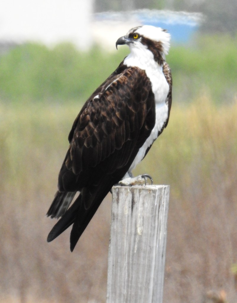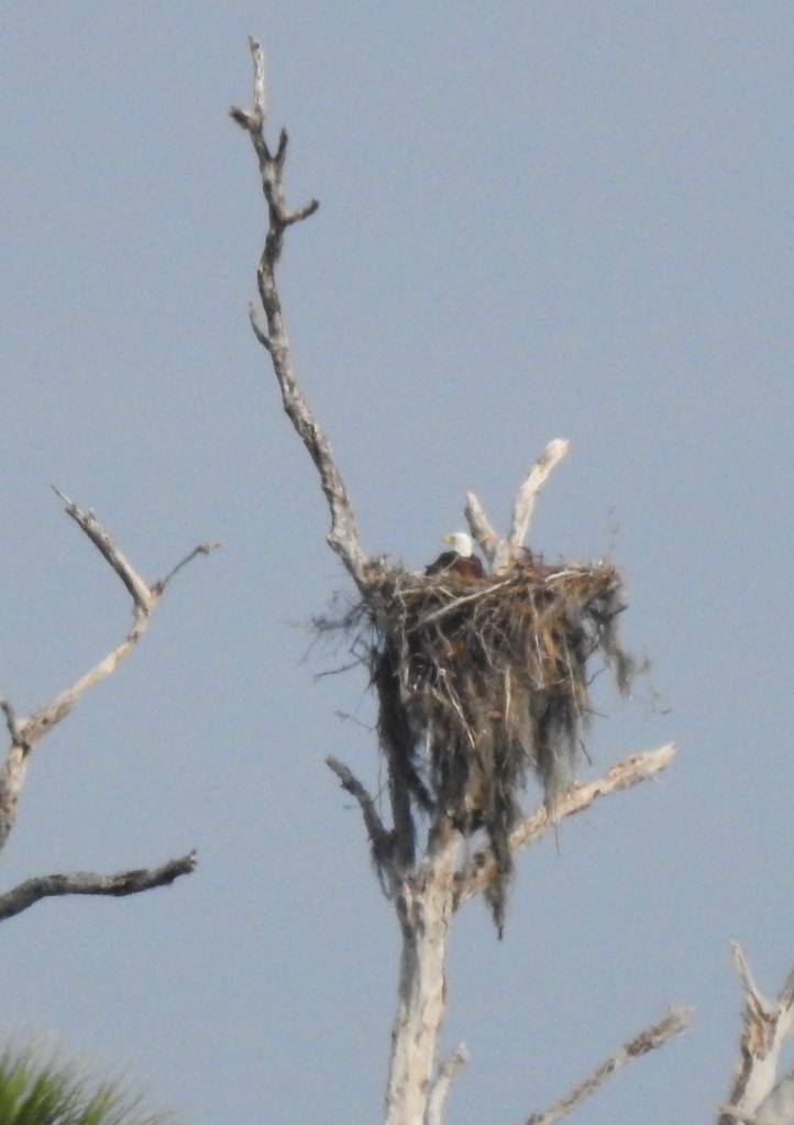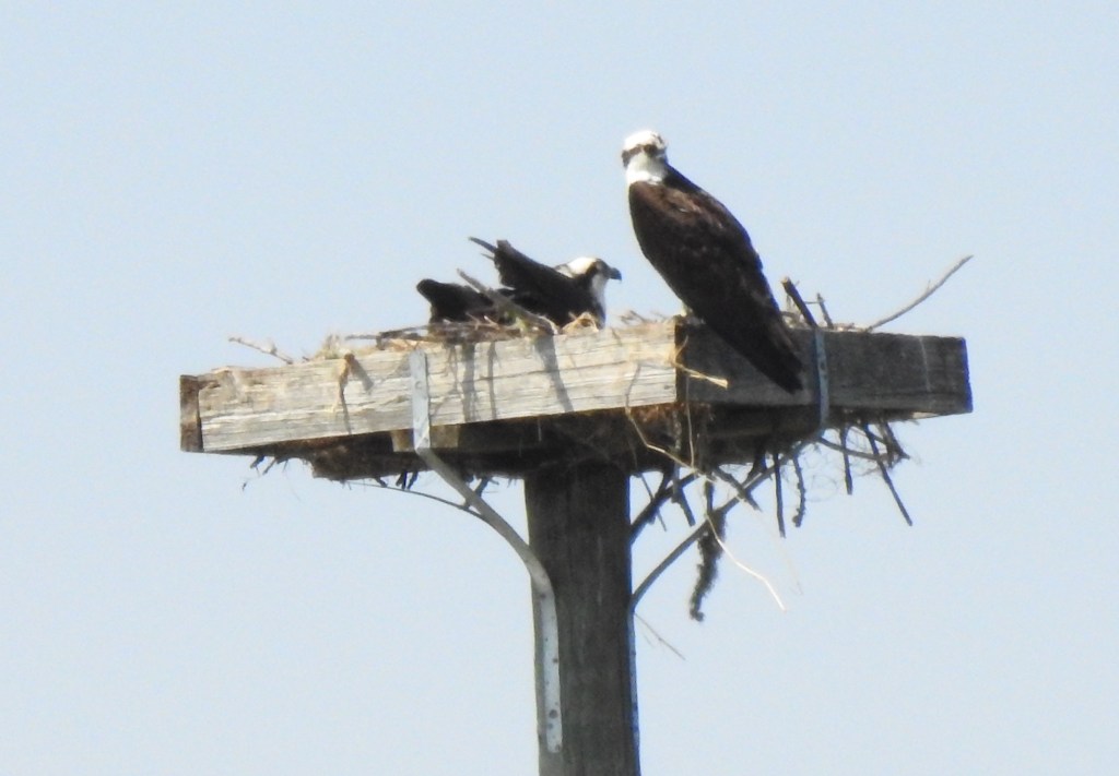 A Bald Eagle on nest and an Osprey on nest with two large young.