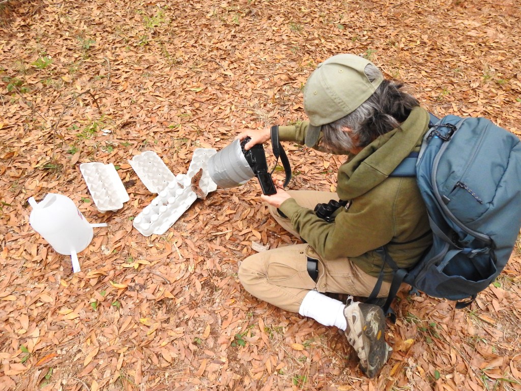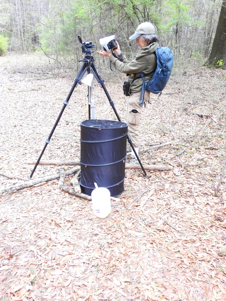 Susan photographing moths that spent the night on the egg cartons in the trap.