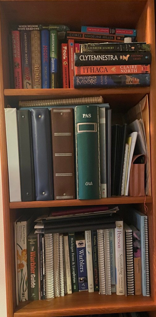 One of the book shelves that is next to the front door entering our house. Fiction, genealogy and old photographs, and natural history. As with any personal library this reflects the owner.