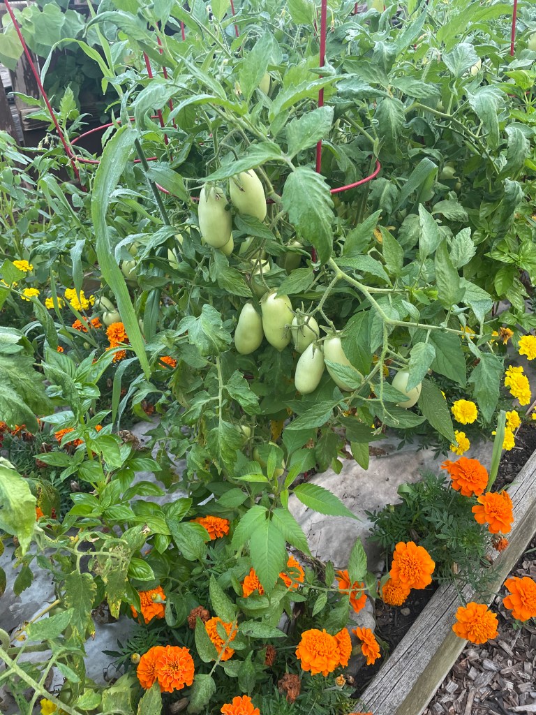 Tomatoes are thriving, enjoying the heat and weekly rain. I imagine that later in August we will once again be swimming in tomatoes.