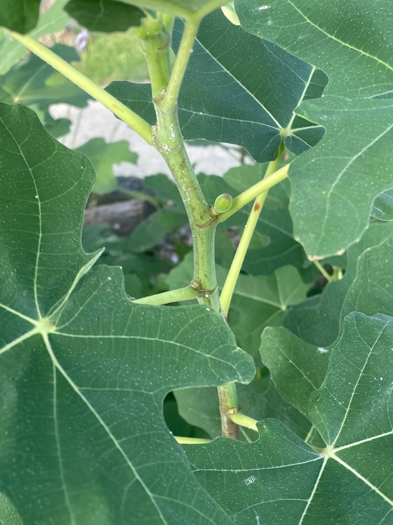 About 5 years ago on a win I planted two fig trees that are supposed to be winter hardy. Over the years they have grown and died back in the winter, always look good in the summer. But no figs. Then two years ago we saw somebody on one of our morning walks that had fig trees with figs. Over the next year we watched how these people dealth with their figs in the winter. They cover the figs with leaf litter and then a tarp over them. The next summer these trees grew more vigorously and fruited. Well, last year I missed the window where I could have done the same and figured that I had missed my opportunity. This year the trees (more appropriately shrubs) spread a bit and grew rather vigorously, Then two days ago I noticed this –