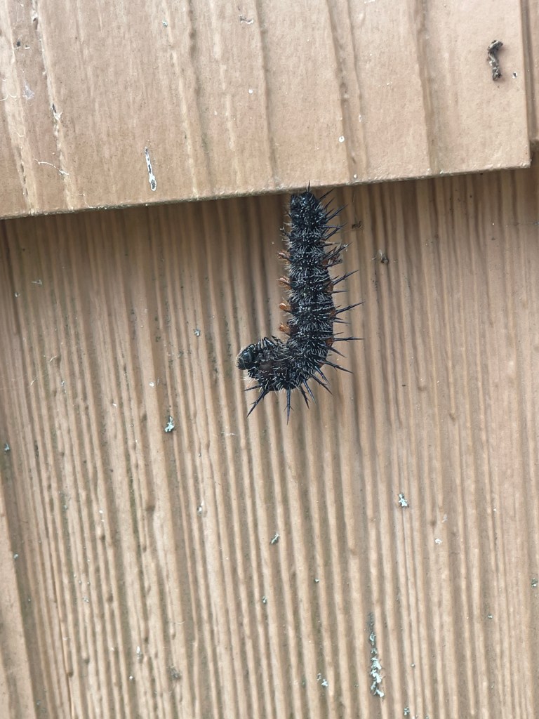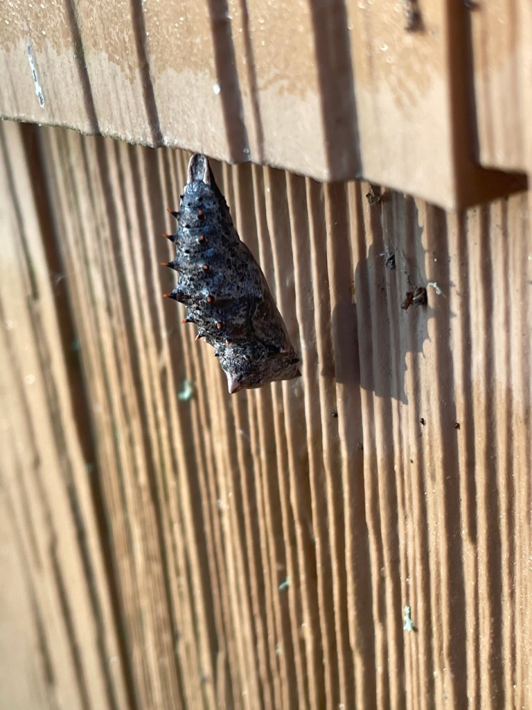 About a week or ten days ago we found a group of Mourning cloak caterpillars on a small willow next to our wood shed. A couple of days ago one of the caterpillars was on the side of the cabin. Two days ago it looked like this was the spot it would spend the winet. Yesterday confirmed that. I hope that it doesn’t freeze there. Normally this would be low in the grasses or on a small shrub.
