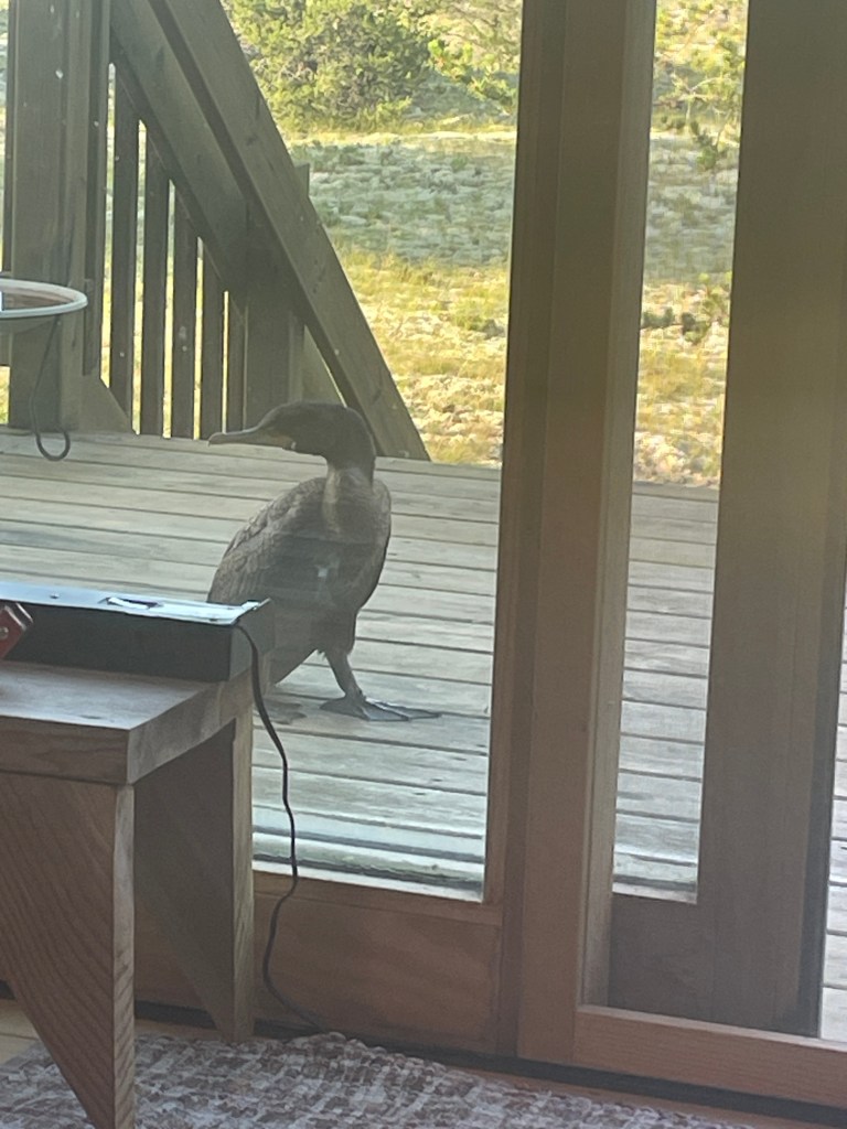 A Double-crested Cormorant showed up on the deck (a first) and wasn’t about to leave. But I walked it to the west edge when it flew down to the grasses and stayed. This is somewhat worrisome. First, having a cormorant in the first place. Second, having it not be immediately worried about me. And finally, having it sit in the grass for over two hours. I think that the bird is sick and the first thing that comes to mind is avian influenza. In the morning the bird was gone. The question is did it fly back to the lake or wander off somewhere to die? More on this if I figure out what happened.