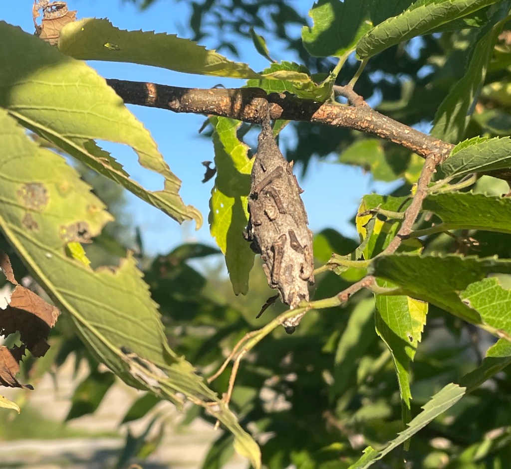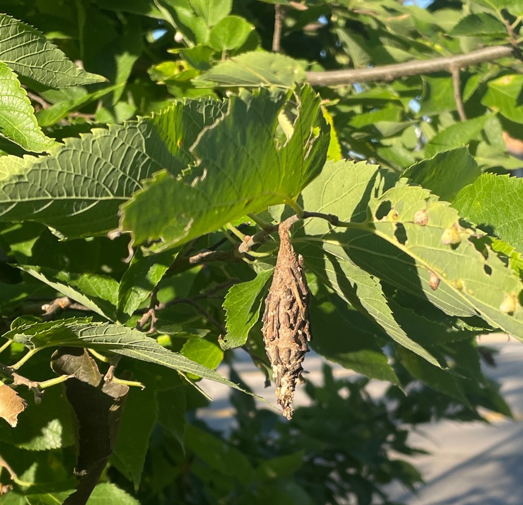 Here are two evergreen bagworm moth cocoons. Even experienced moth fans might miss these since these “should not” be in deciduous trees.