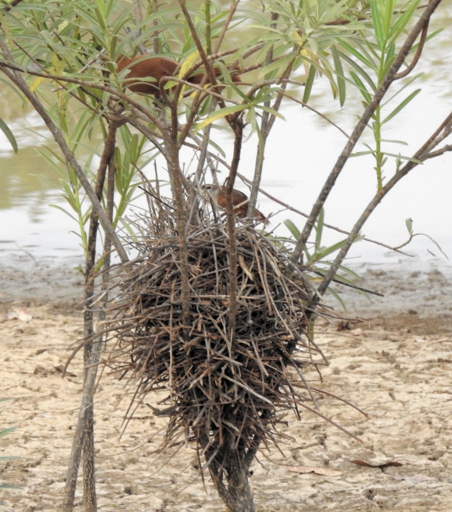 I really like finding nests. The bird on the left is a Crested Oropendola at a nest. On the right are Greater Thornbirds at a nest.