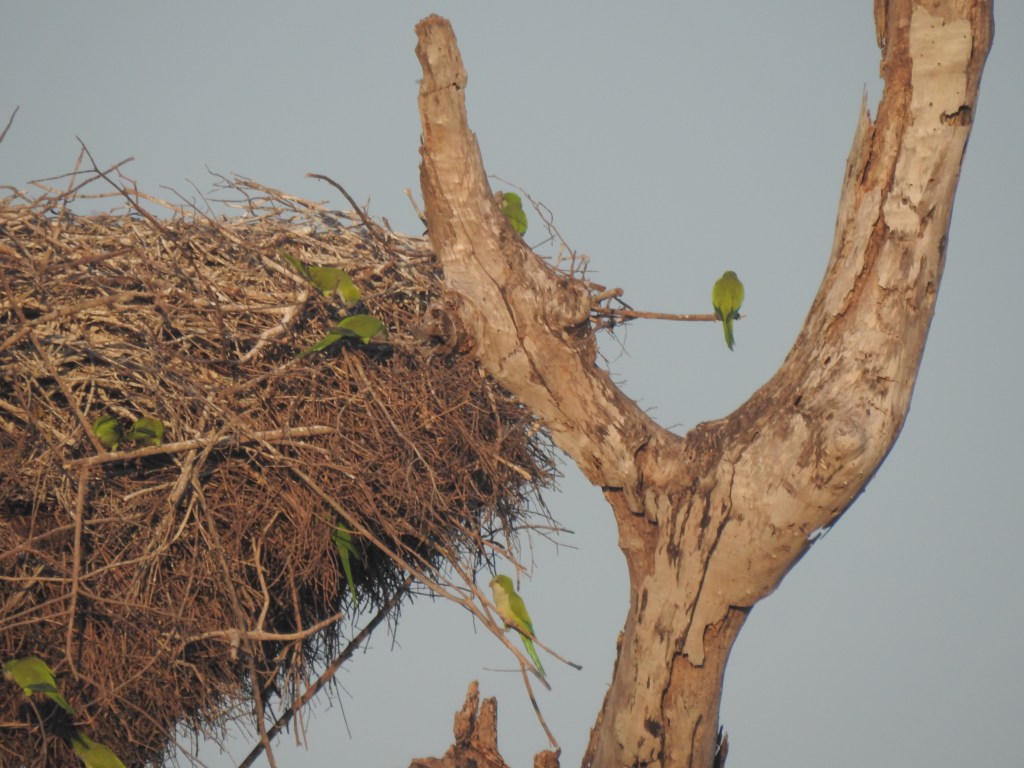 A group of Monk Parakeets nesting under a Jabiru nest.