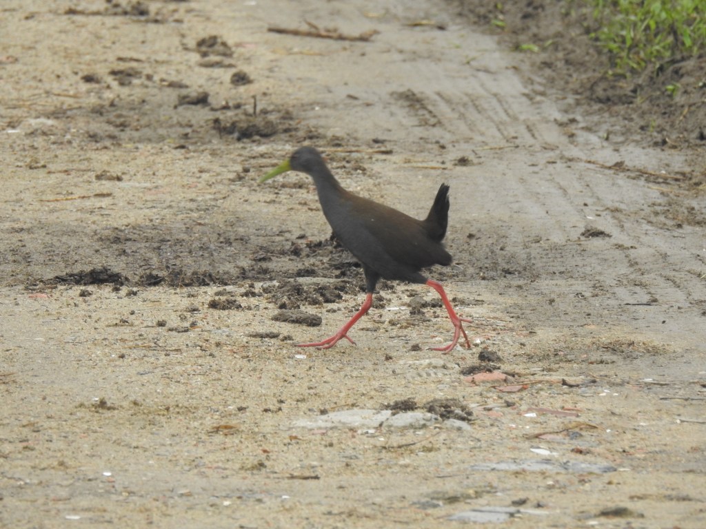Blackish Rail running across the road.
