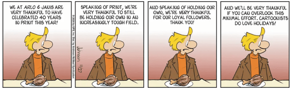 1. Amen. The comics were so nice to read, thank you for including. When I lost my parents, that holiday world that lasted more than 60 years just vanished. My mother was a work horse, and the best cook and baker in the universe. Our family mostly always came to our house. I still cook, it’s just not the same. I still watch the parade and look for the Snoopy float, our favorite! (though somehow missed it again this year!) I really love the cartoons, thank you, and Happy Thanksgiving.
