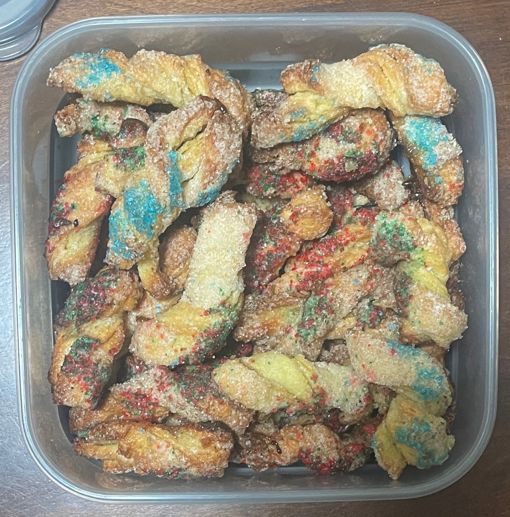 When we got home I read two chapters of Another Fine Myth to Camilla and Oscar. Then Susan made everybodies favorite Christmas cookies – twist-twists,