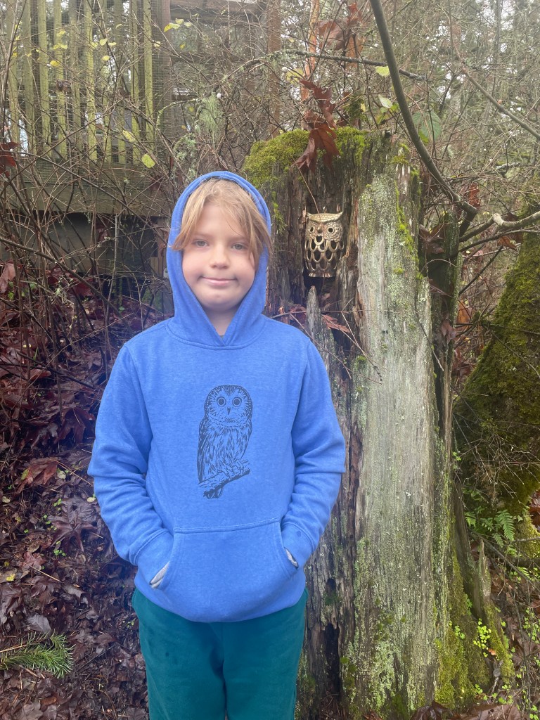 Susan and Oscar with a very noisy Snowy Owl. Oscar next to the “golden owl.”