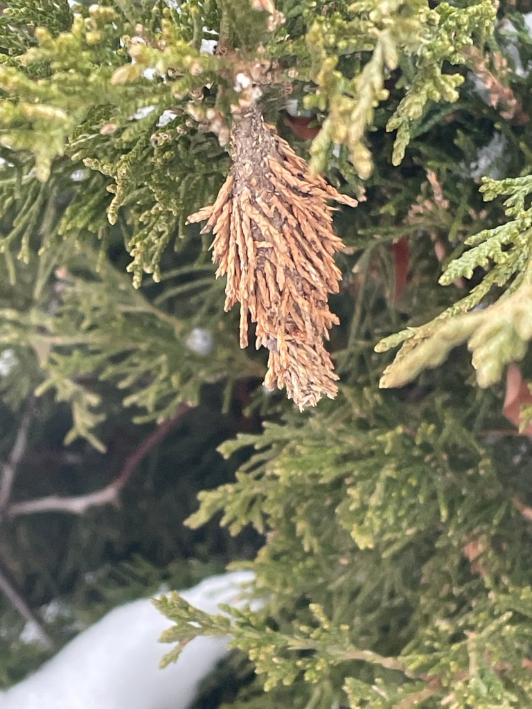 The first moth of the year! An evergreen bagworm moth cocoon.