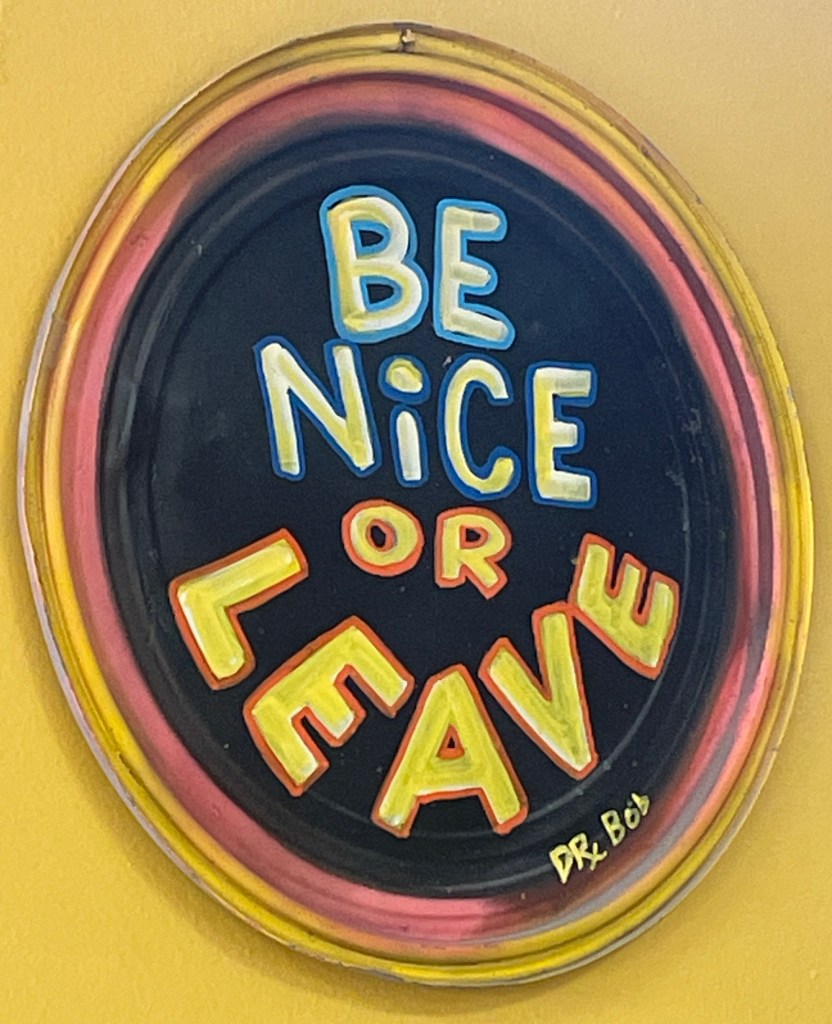 Whatever is on the walls is also interesting and laughably informative. Years ago I bought a fire peccary from the artist who made it and was displaying it here. He was a school psychologist who used recycled materials for art, keeping them from the landfill or being melted for the copper. Susan and I would drive by the bakery and see it with Susan admiring it every time. Then one day it was gone, and she lamented it’s absence but hoped that it had found a nice new home. Later that year I gave it to her on her birthday, which still brings a smile to both of us.