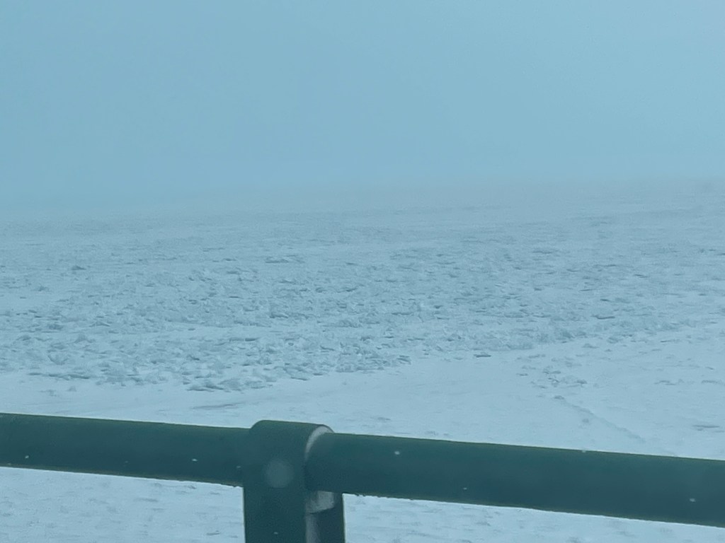 We crossed north in very light snow and the straights were completely iced in.