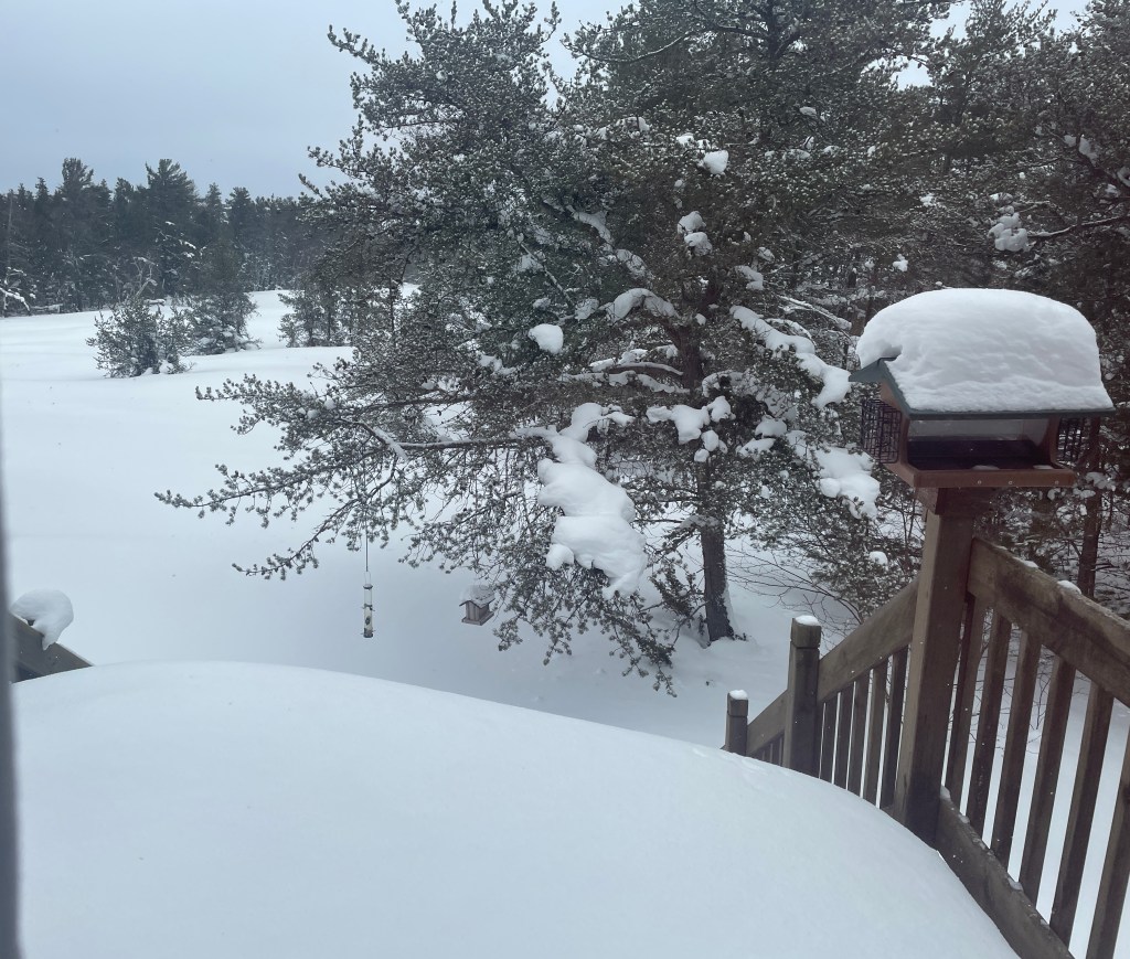 It appears to have snowed a bit since we were last here. There’s several feet on the deck and a good 8-10 inches on the bird feeder.