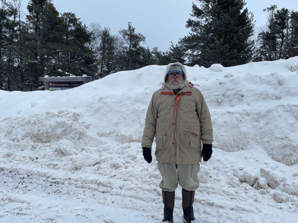 Here I am with a mound of about seven feet of snow behind me. No walking to the point today.
