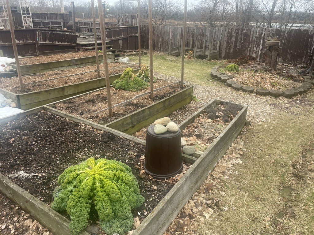 This was the garden two days ago, almost snow free. We’re still getting kale, even when covered with snow. Thyme and parsley are still ready for the taking and chives have started. I’ve tried overwintering rosemary, and we’ll see how that goes. But at that point I was thinking about garlib, tomatoes, basil and green beans.
