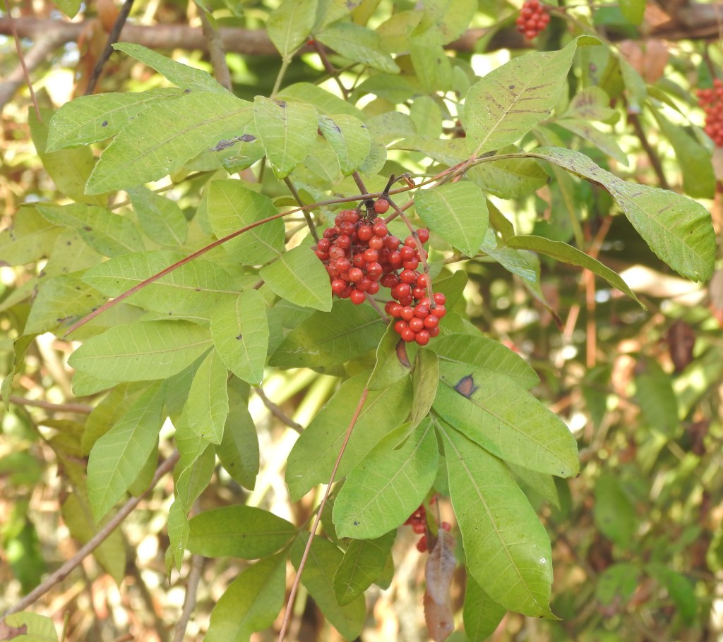 There was also a lot of poison ivy (on the left) which is an obnoxious plant, but is at least native and birds, especially robins and warblers eat the berries. The plant on the right is Brazilian pepper, an invasive shrub who fruit are unfortunitly liked the same birds and spreads like a cancer along waterways. There are so many seeds in the seed bank that it will take years of serious effort to get rid of this cancer on the environment.