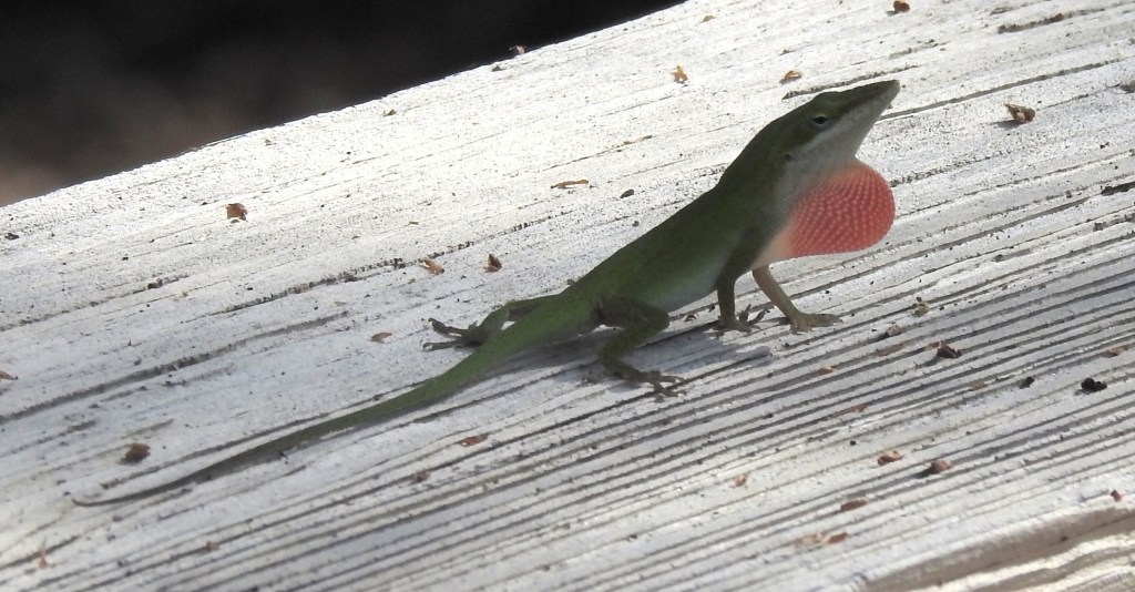 A Green anole with it’s orange dew-lap extended showing off for us.