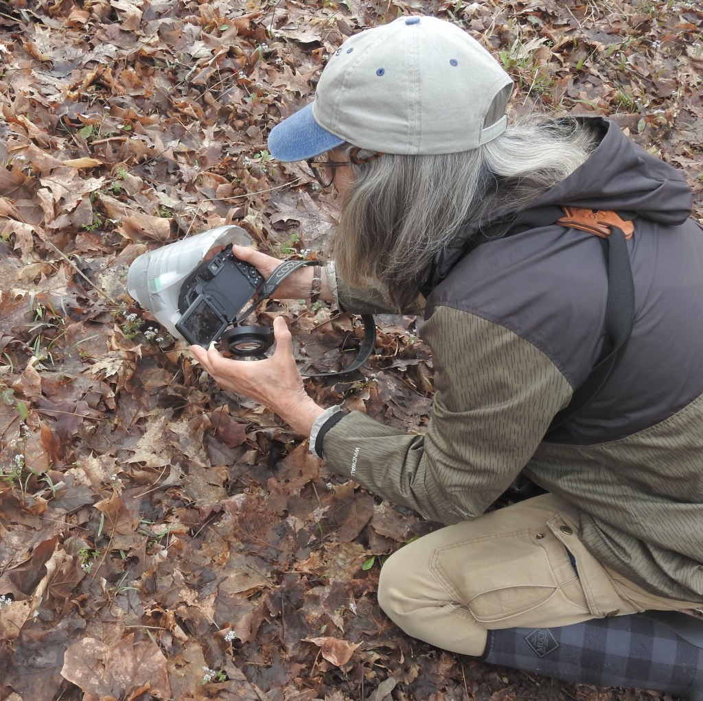 To have a better idea of the small size of harbinger-of-spring here’s Susan photographing some.