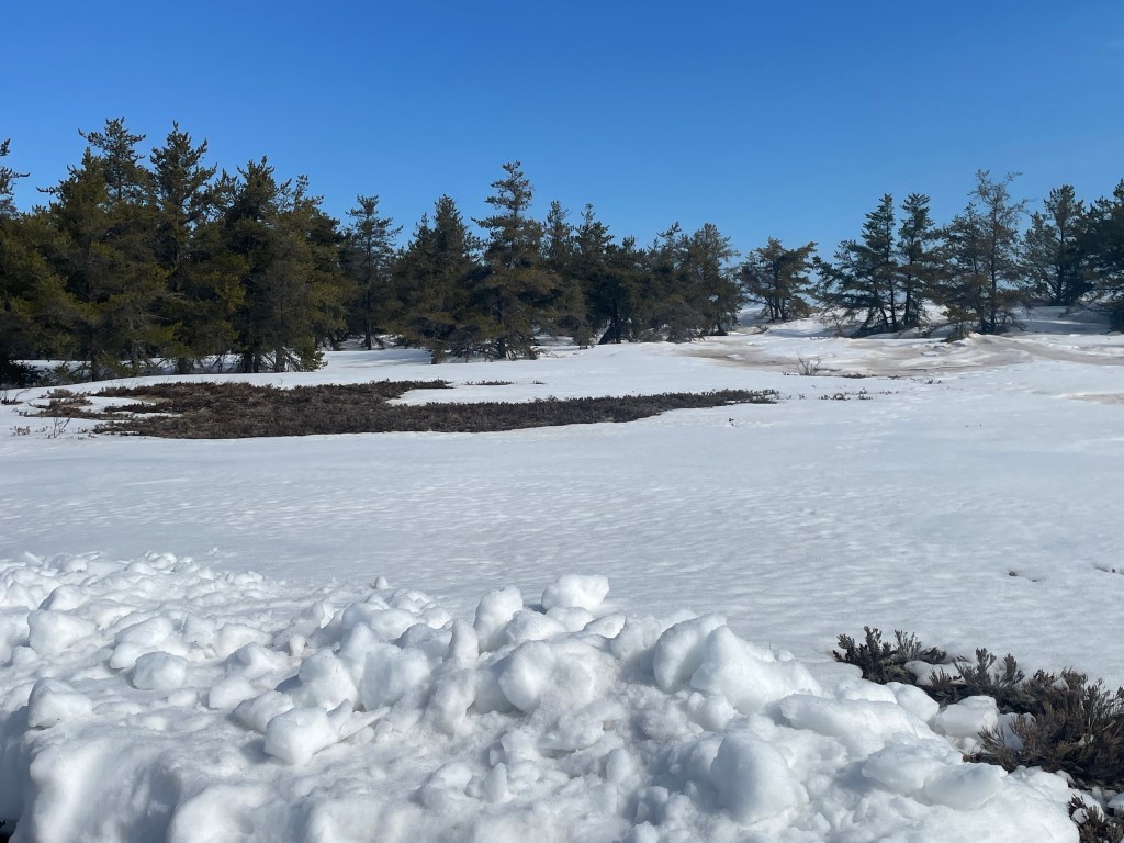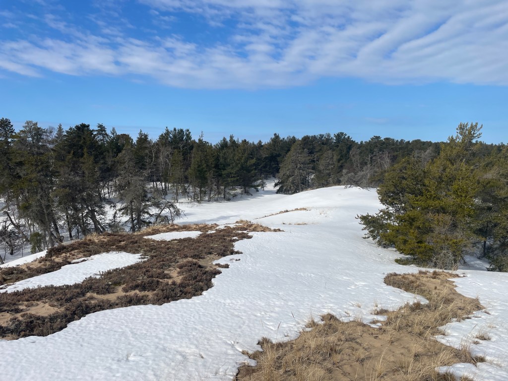 The view at the point looking east towards Canada. There are still huge ice mounds fopped with sand. This bodes well for more sand being deposited on the beach, thus growing the point.