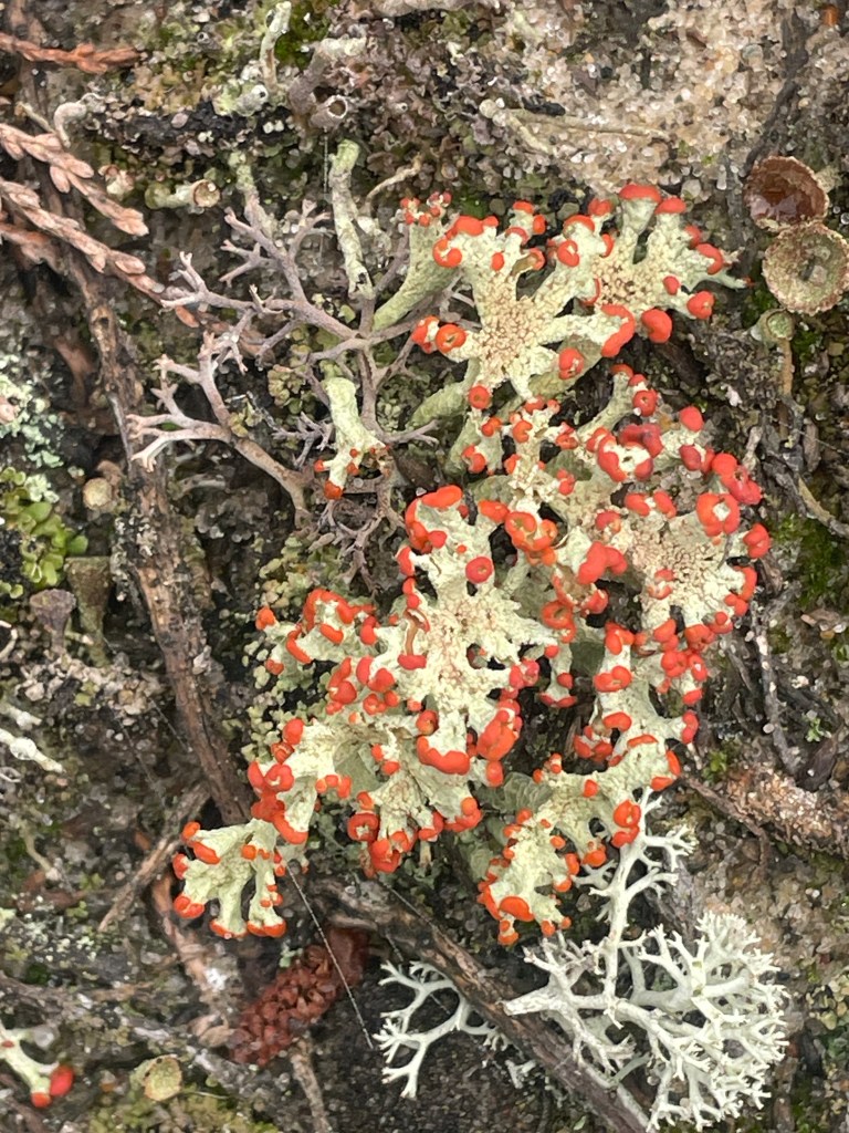Rock foam lichen on the left, which does look like foam from a distance. Red-fringed pixie-cup in the center right, surrounded by several other green and red British soldier-type lichens.